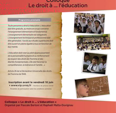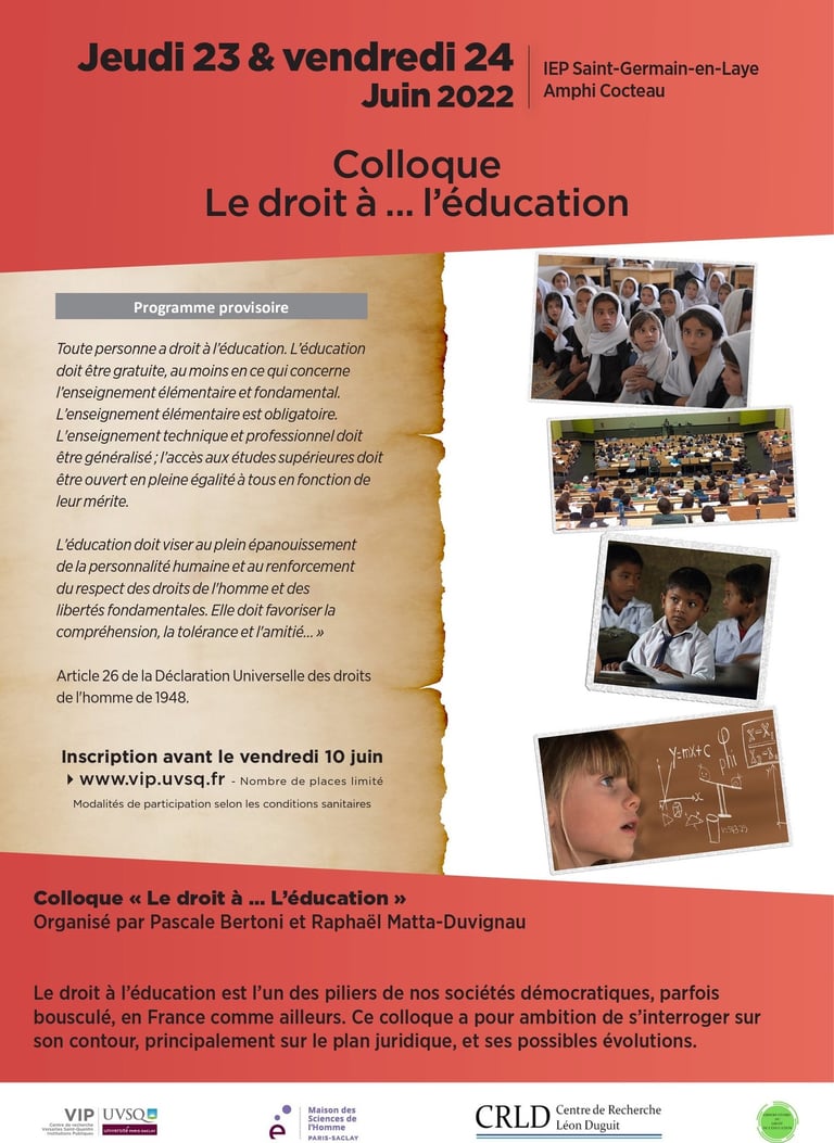 Ce colloque a réuni divers intervenants sur le thème du droit à l’éducation. Il s’inscrit dans le cadre d’une démarche collective visant à promouvoir l’émergence d’une discipline juridique identifiée, le droit de l’éducation. Il s’inscrit dans le prolongement du « Dictionnaire critique du droit de l’éducation » (Éditions Mare & Martin) visant à réunir autour d’un objectif commun l’ensemble des acteurs du monde éducatif (universitaires, inspecteurs généraux, avocats, magistrats, responsables des services juridiques académiques et ministériels). Plus spécifique que le dictionnaire, il se concentre sur le thème du droit à l’éducation, en aborde les contours et en souligne les limites. Il en dégage les potentielles évolutions et les sources de difficultés futures en recourant principalement à des juristes, sans se priver toutefois de l’analyse d’autres disciplines telles la sociologie et les sciences de l’éducation.